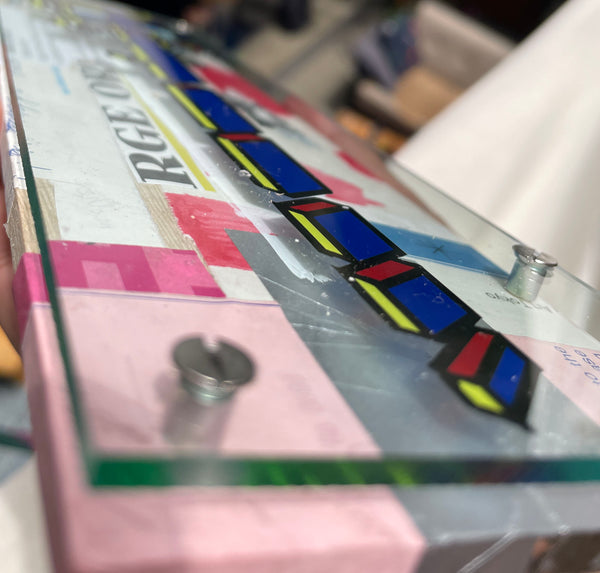 コラージュにUVプリントされたアクリル板が固定してあります。(同じ絵柄のアクリルに新規コラージュの制作も別途可能です。ご希望の方はご連絡ください)
