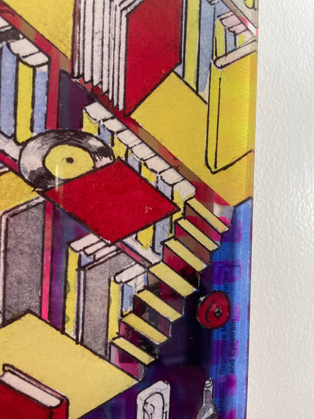 The collage has a UV printed acrylic board screwed to it. (It is also possible to create a new collage on acrylic with the same design.  Please contact us if you wish.)