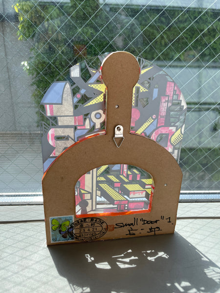コラージュされたMDFボードにUVプリントされたアクリル板が固定してあります。