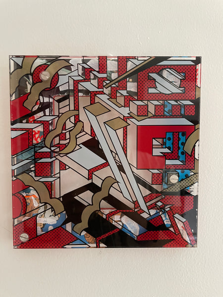 UV printed acrylic panels are fixed to collaged MDF boards.