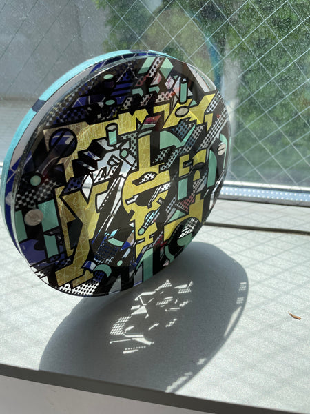 コラージュされたMDFボードにUVプリントされたアクリル板が固定してあります。